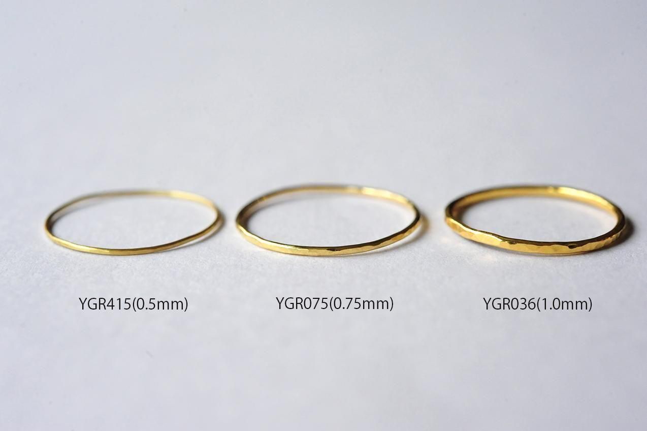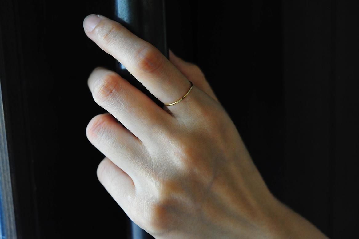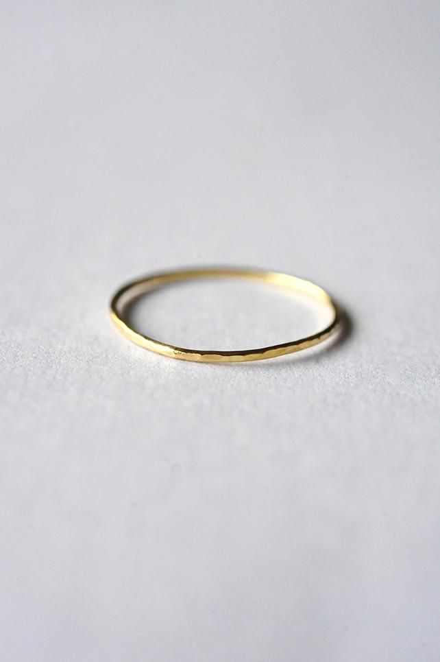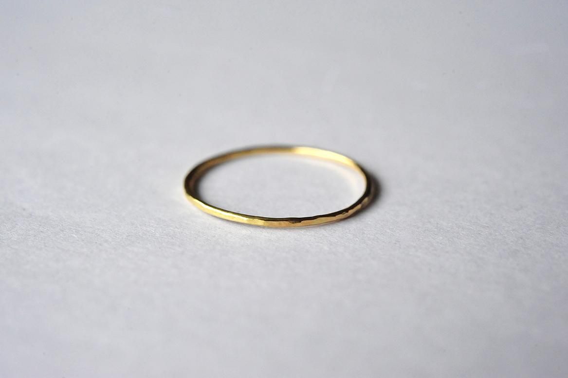 シンプルで華奢なゴールドリング。表面に金槌で打ち込んだ模様を入れてあります。