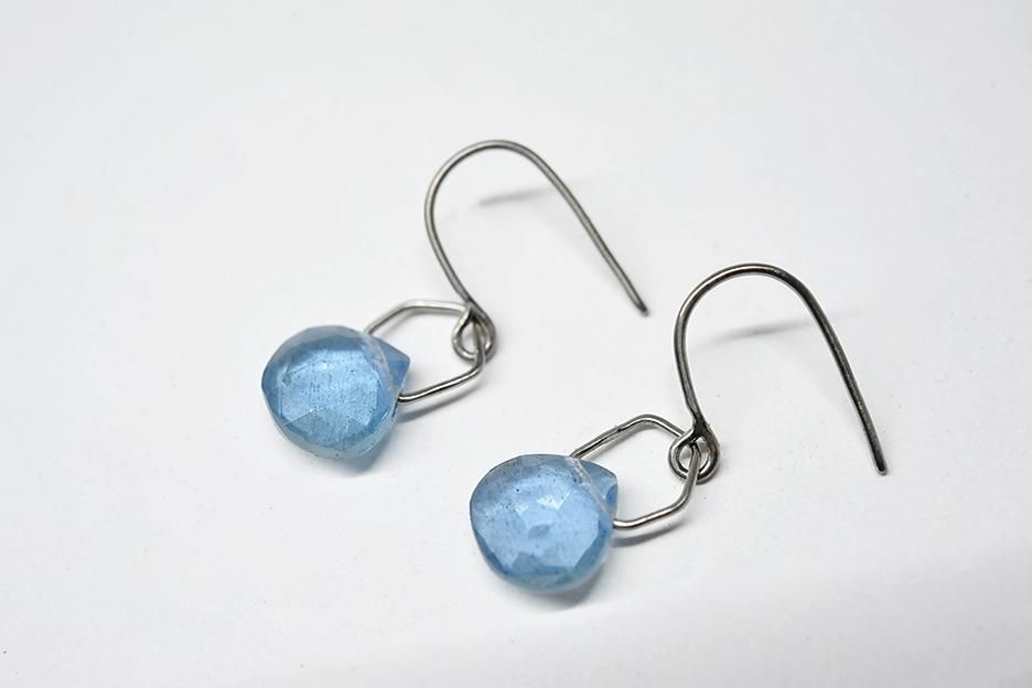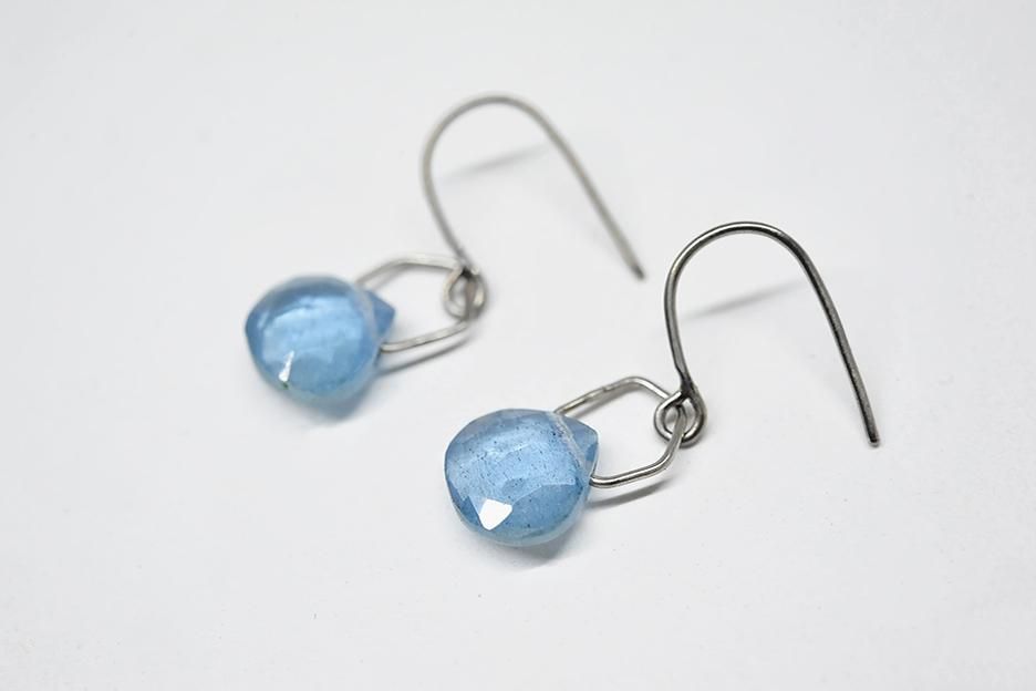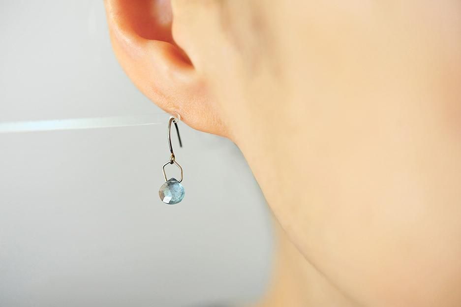 五角形のラインに、マロンカットのモスアクアマリンを通したチタン製のフックタイプのピアスです。