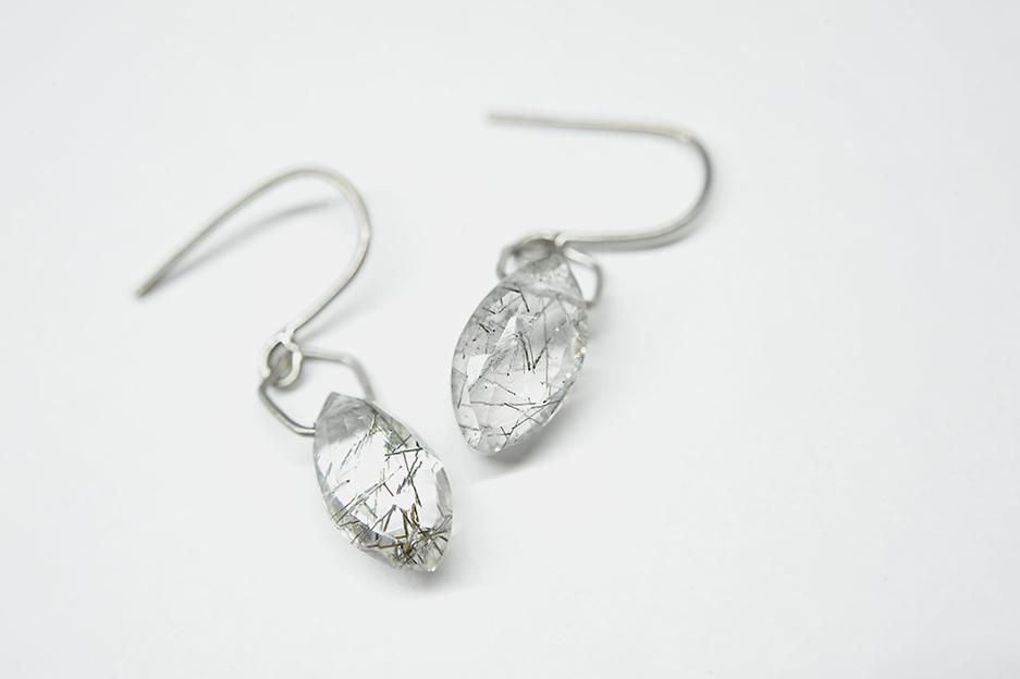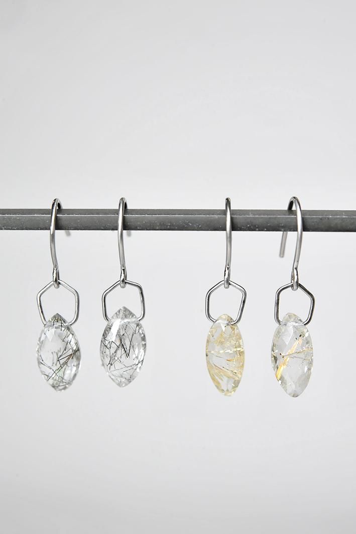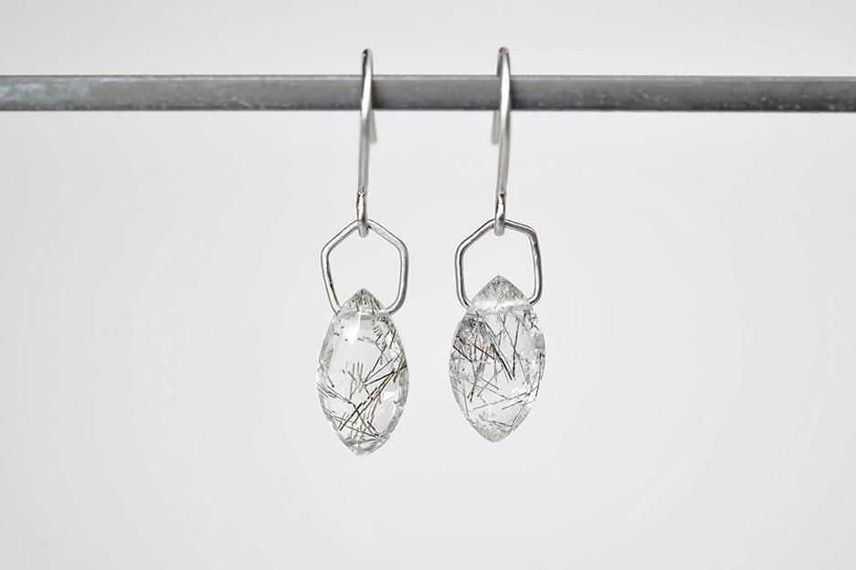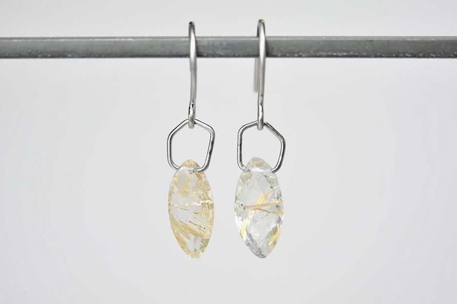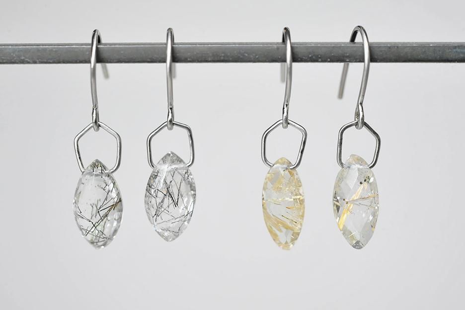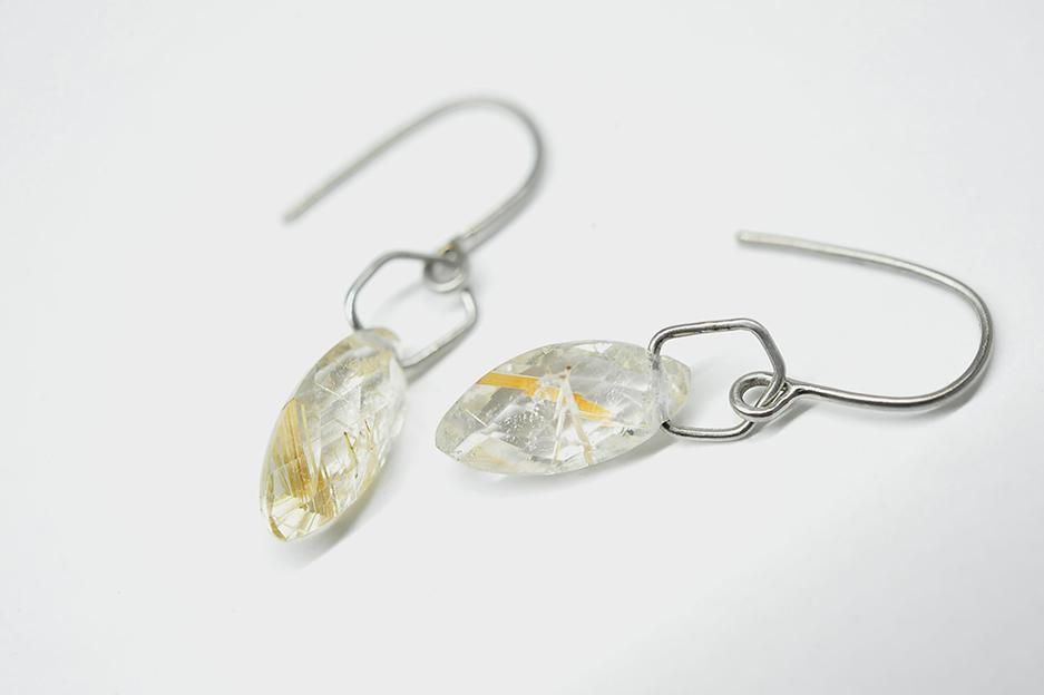 五角形のラインに、マーキスカットのクォーツを通したチタン製のフックタイプのピアスです。