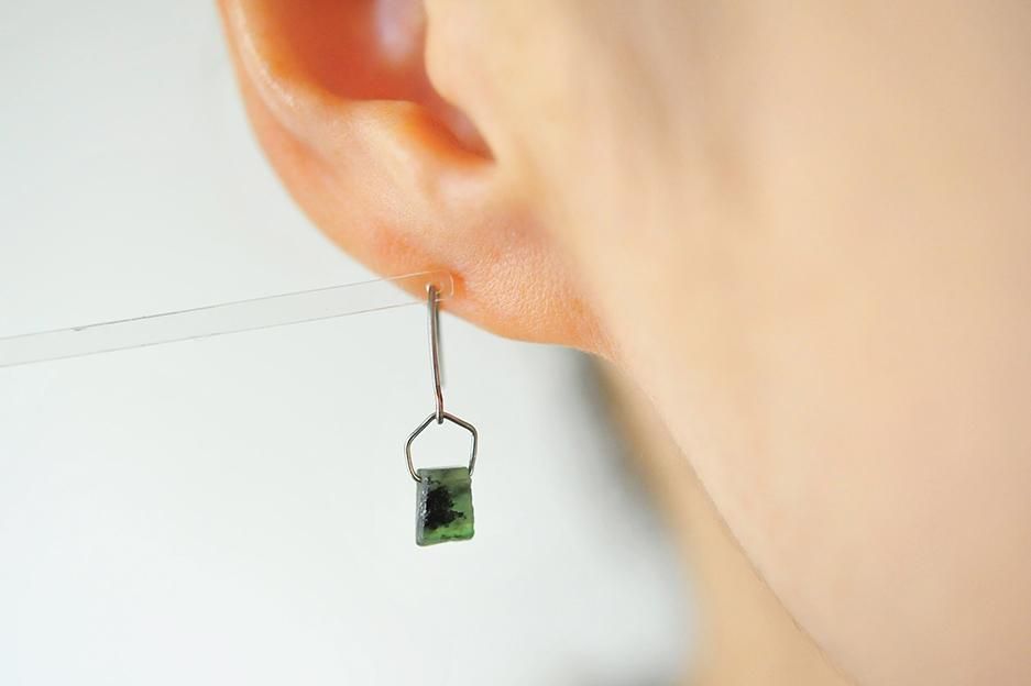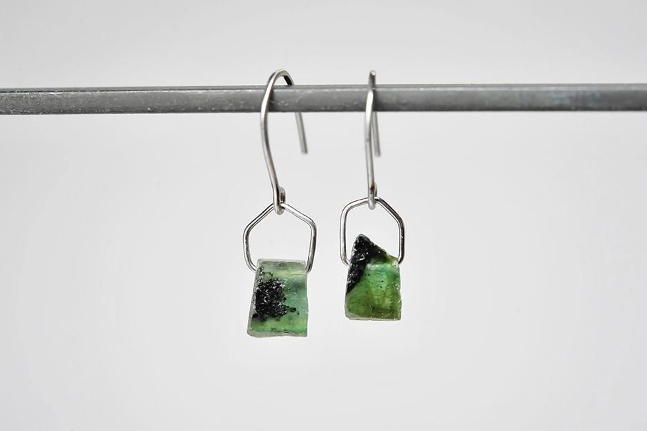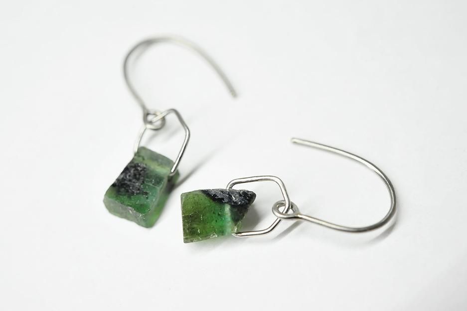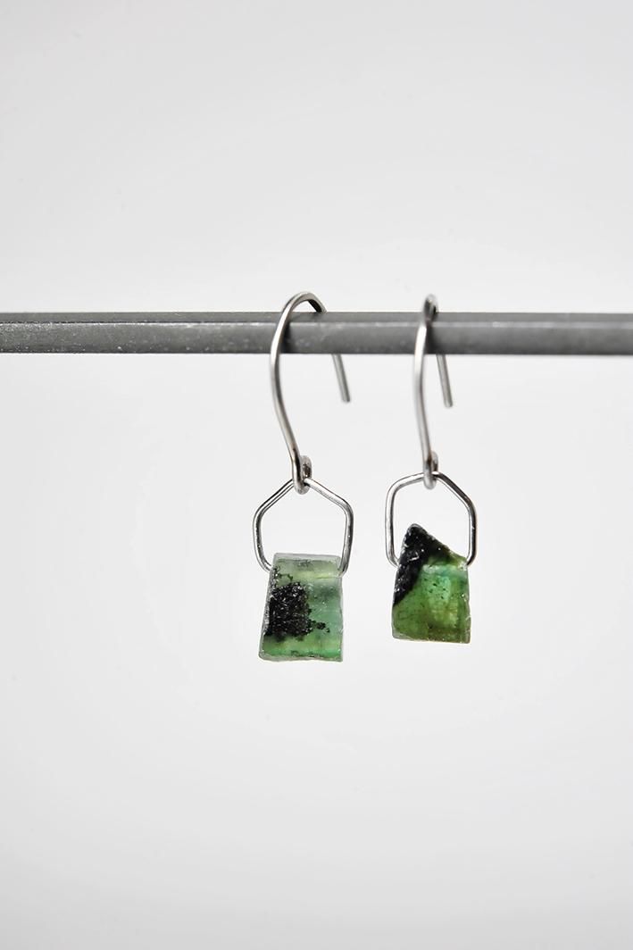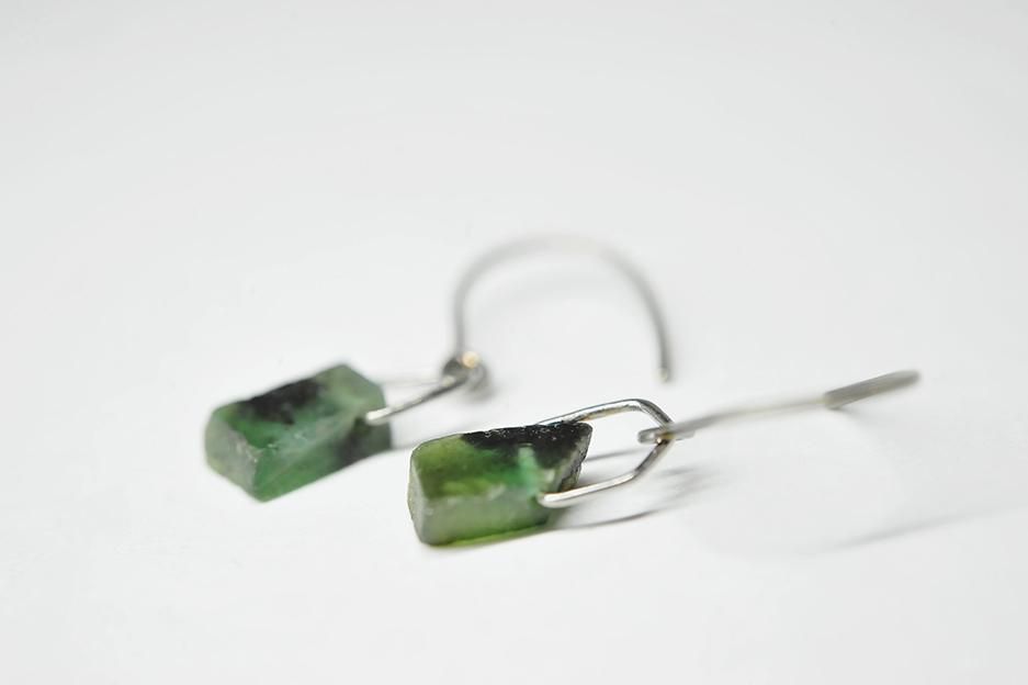 五角形のチタン製のラインに、エメラルドを通したフックタイプのピアスです。