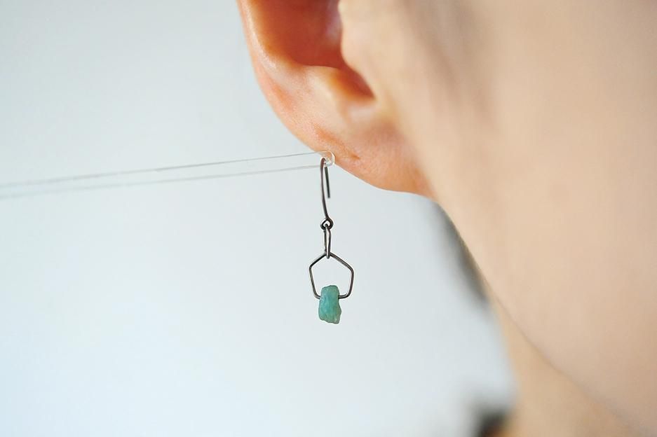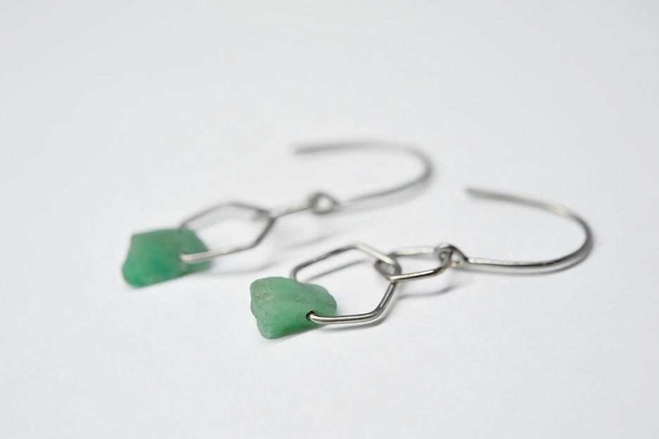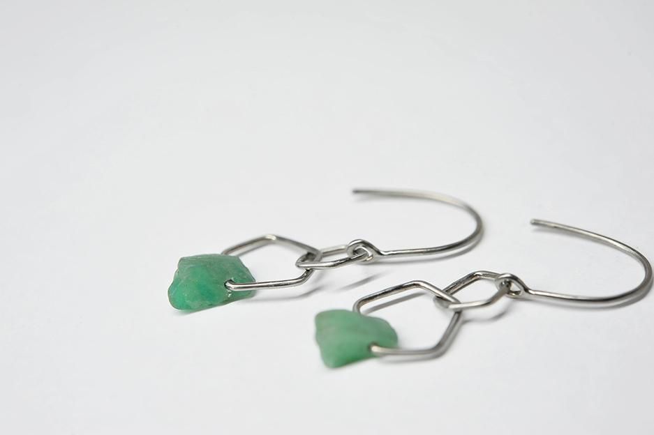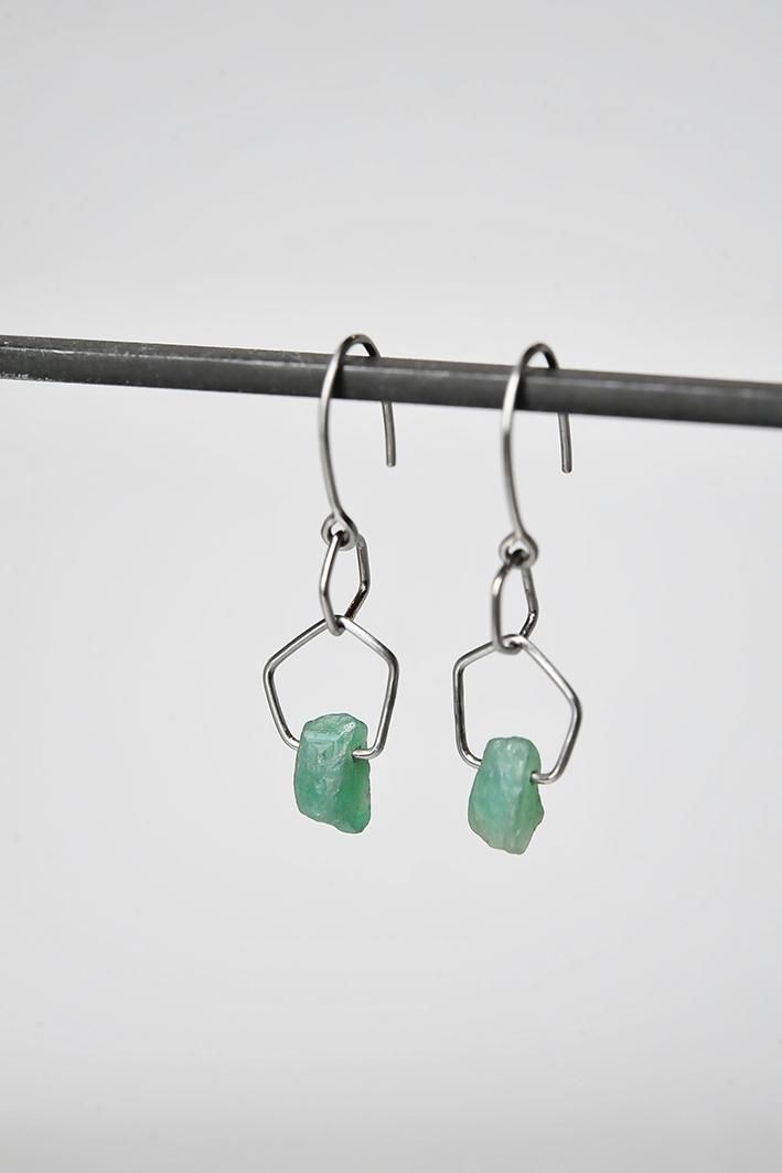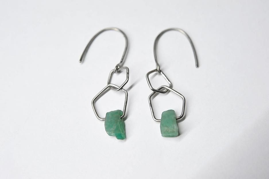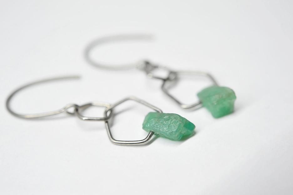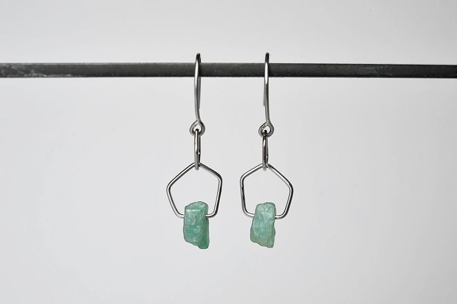 五角形のチタン製のライン2つに、エメラルドを通したフックタイプのピアスです。