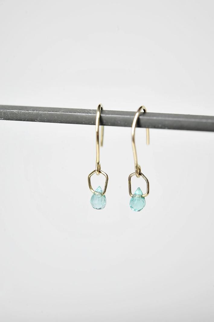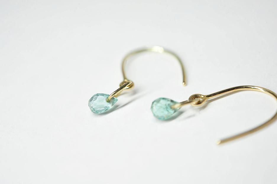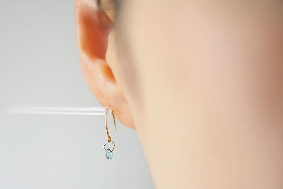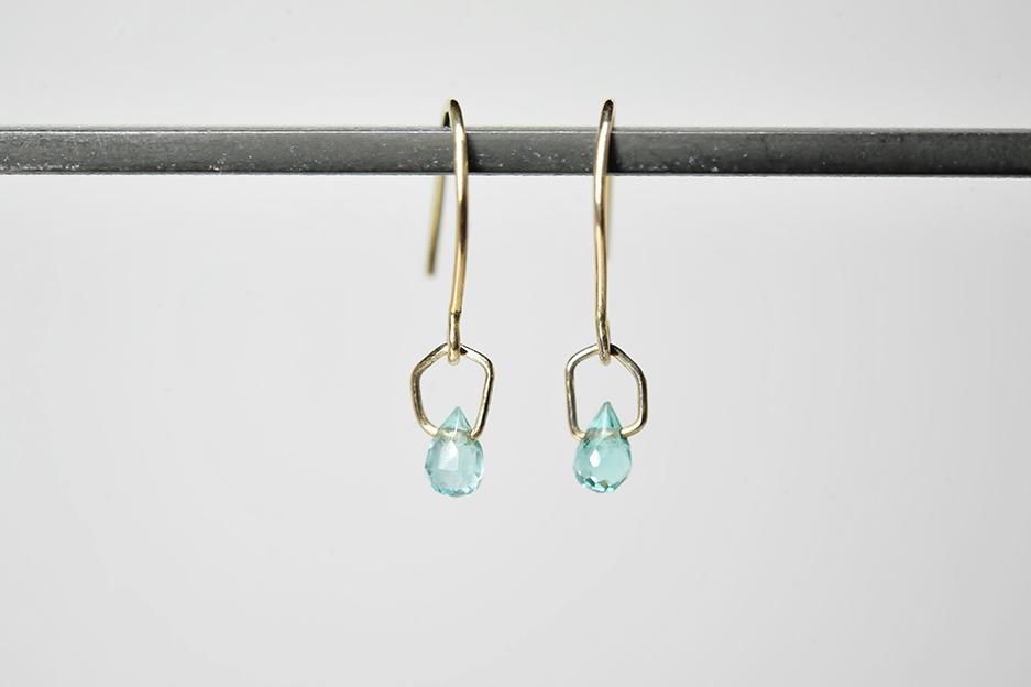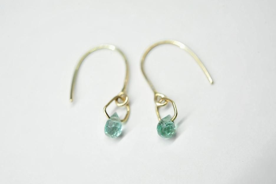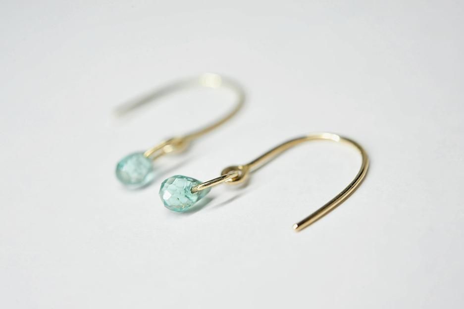 細い五角形のラインに、透明度の高いライトカラーのエメラルドを通したK10YGのフックタイプのピアスです。