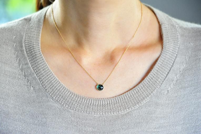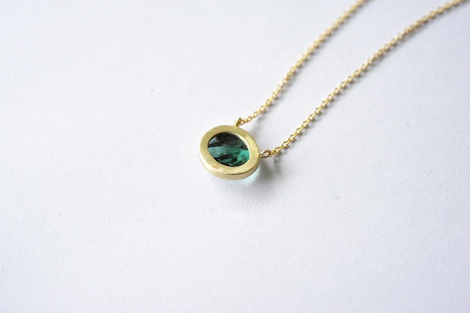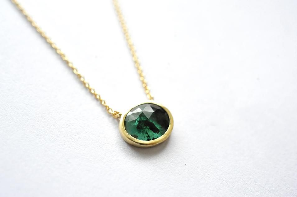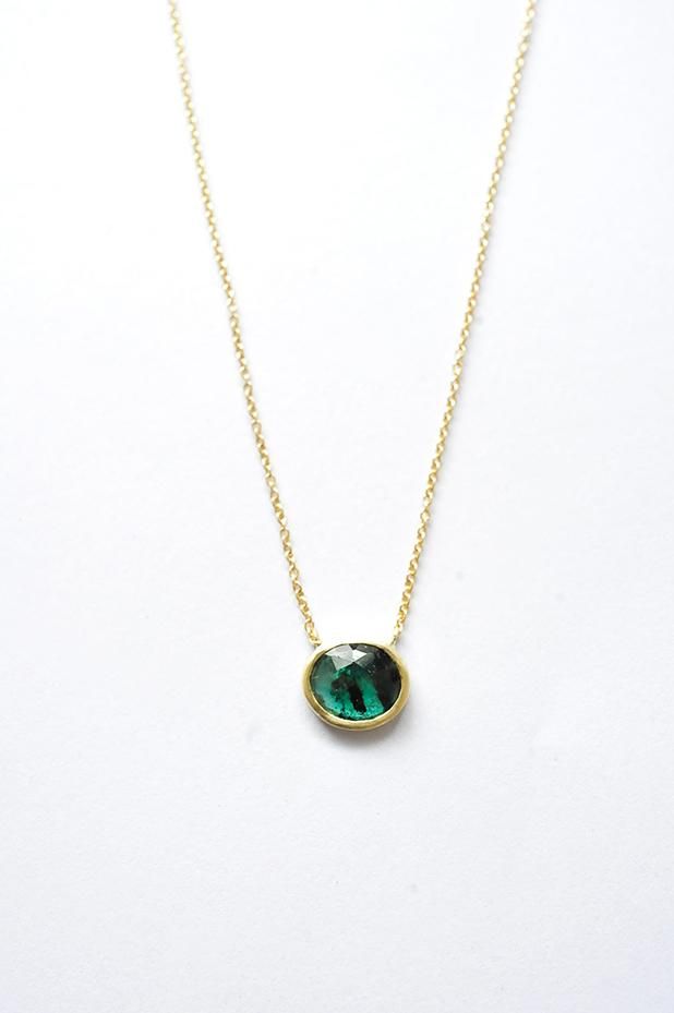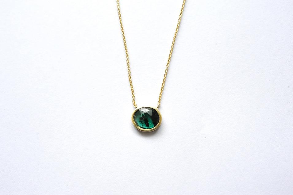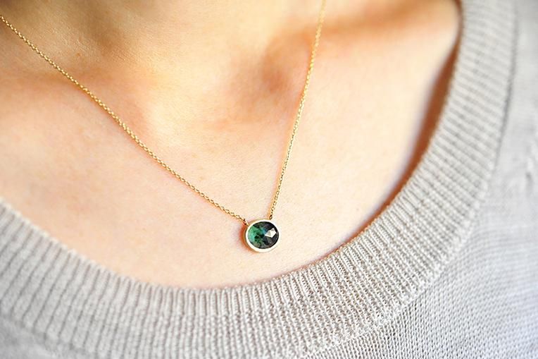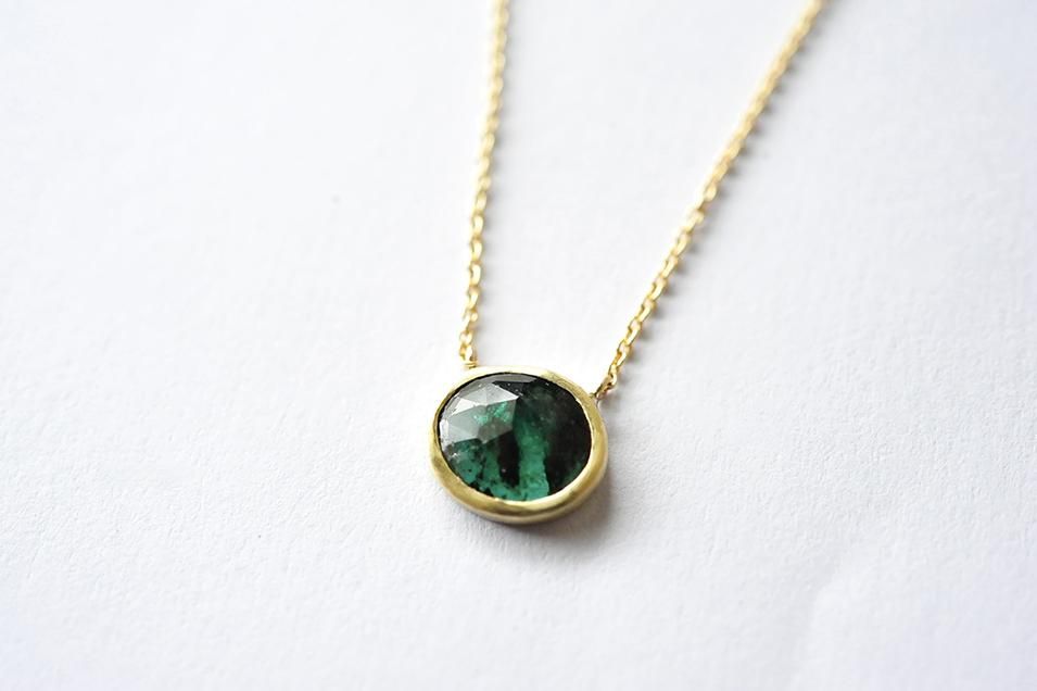 ローズカットのエメラルドをK9YGの石枠で留めたネックレスです。